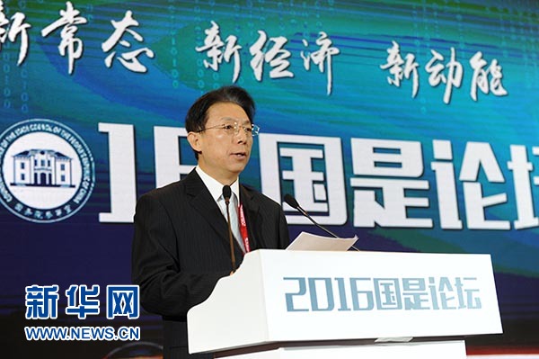 11月24日,由国务院参事室主办、新华网承办的“2016国是论坛”在北京首都大酒店召开。本届论坛聚焦“新常态、新经济、新动能”。图为新华社副社长兼常务副总编辑周树春在开幕式上致辞。新华网记者 翟子赫 摄