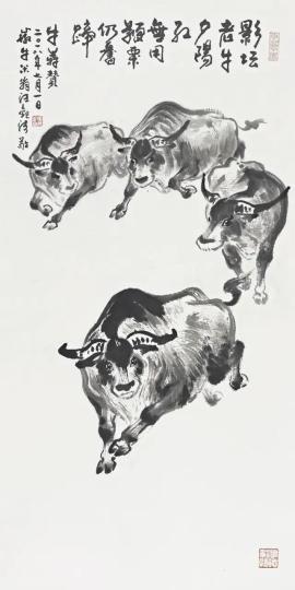 此外,张渊馆员专题创作的国画作品《龙华千古仰高风》表现的是龙华烈士陵园扩建,是她今年在写生基础上精心构思创作的,表达了她对革命先烈的缅怀和敬意。毛国伦馆员专题创作《不用扬鞭自奋蹄》,结合牛年绘群牛像,寓意发扬孺子牛、拓荒牛、老黄牛精神,以不怕苦、能吃苦的牛劲牛力,继续为中华民族伟大复兴辛勤耕耘、勇往直前。乐震文馆员专题创作国画作品《梁家河秋色》,他曾去梁家河采风写生,听说文史馆要举办主题展览,他连夜创作,以佳作“贺建党百年,替山河立传,为时代留影”。