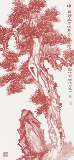 龚继先馆员擅长水墨大写意花鸟,曾向上海市文史馆捐赠36幅精品,此次专题创作《苍松图》,他特意用吉祥的朱砂色在六尺整纸上绘就巨松,并用朱砂色题“中国共产党百年华诞誌庆”。韩天衡馆员专题创作书法作品《使命在肩初心如磐》和国画作品《松鹤千秋》,是他专程为此次展览新创的主题书画作品,作品《使命在肩初心如磐》,表达了他不忘初心、牢记使命的坚定信念。作品《松鹤千秋》表达了他对建党百年华诞的美好祝福。