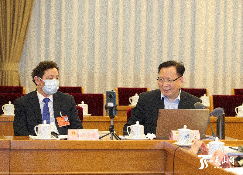 3月6日,参加十三届全国人大五次会议的新疆代表团举行小组会议,审议政府工作报告,审查计划报告和预算报告。何星亮代表(右)围绕加快民族地区现代化步伐和依法治疆等方面内容提出建议。天山网-新疆日报记者 崔志坚 摄