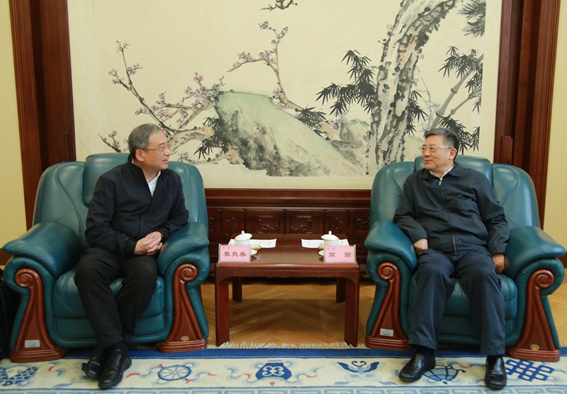 5月9日下午,国务院参事室党组书记、主任高雨在京会见上海市人民政府参事室党组书记、主任莫负春一行。
